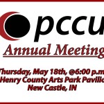 Calling All Members! Join us on Thursday, May 18th for the Annual Meeting of the PCCU Membership. We will gather at the Henry County Arts Park Pavilion. The Park is located at 218 South 15th Street, in New Castle, near the Henry County Public Library. In deference to current conditions, no food or beverages will be served. Beginning at 6:00 p.m., we’ll have our business meeting and review the credit union’s standing with the Board…